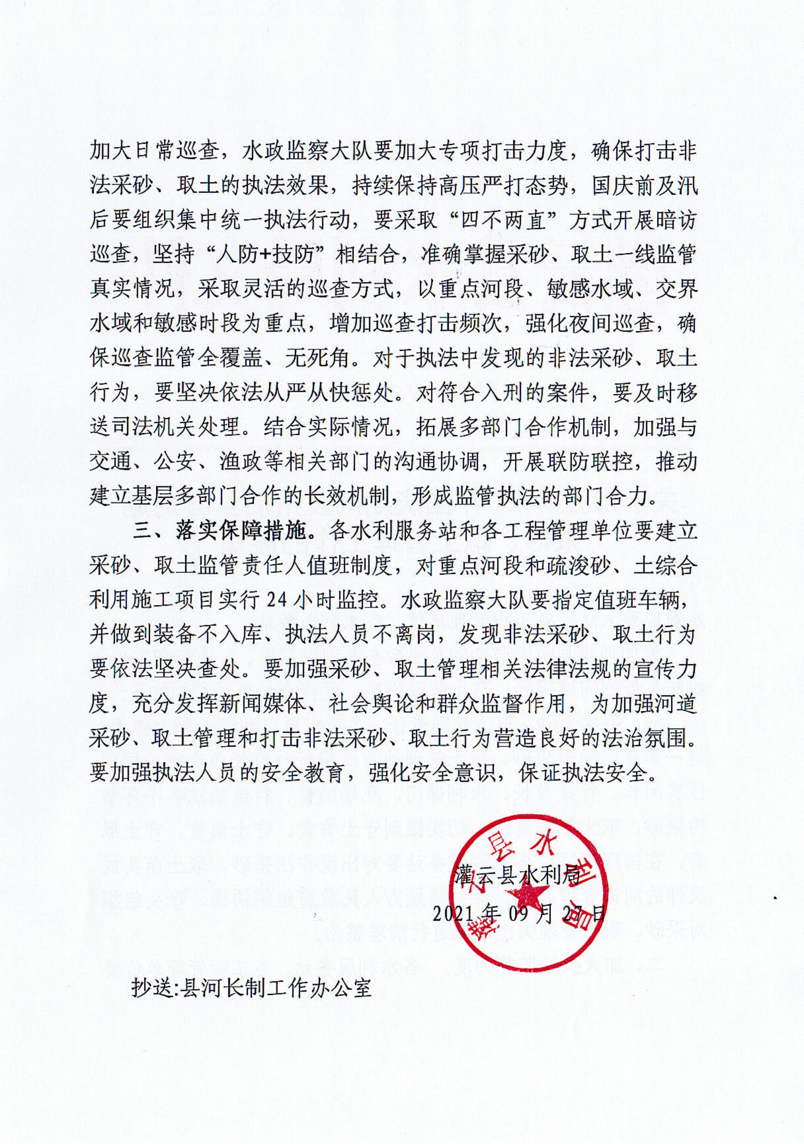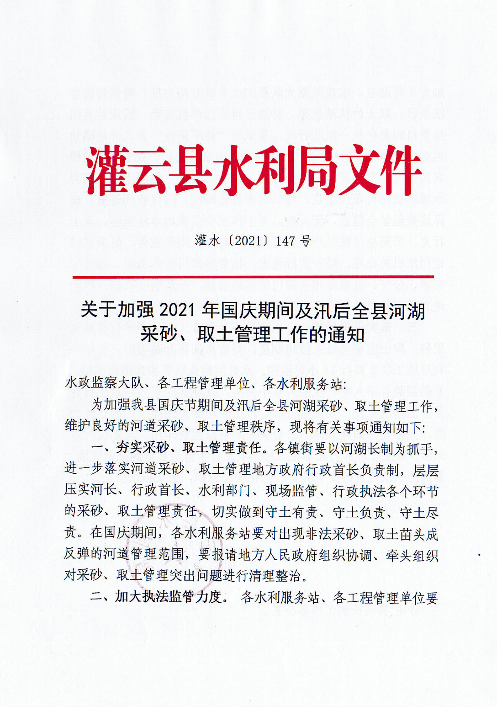 关于加强2021年国庆期间及汛后全县河湖采砂、取土管理工作的通知