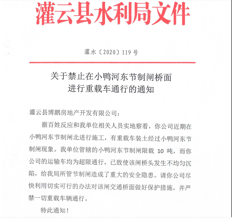 关于禁止在小鸭河东节制闸桥面进行重载车通行的通知