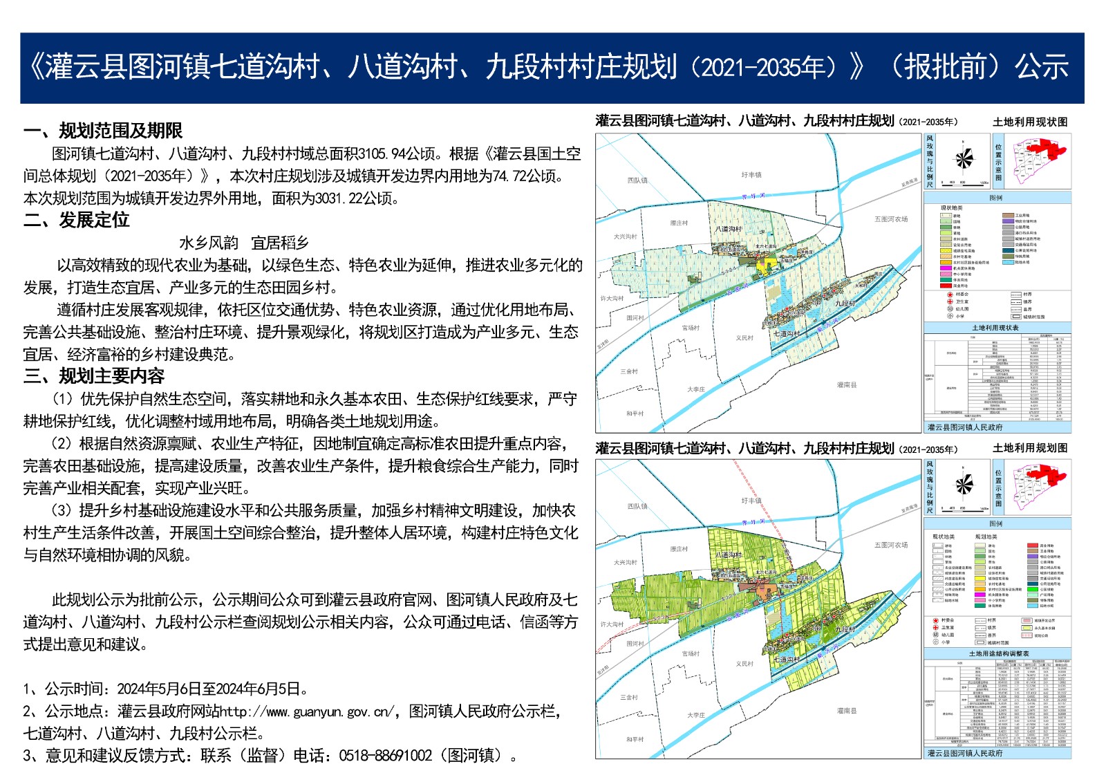 | 标 题 | 《灌云县图河镇七道沟村、八道沟村、九段村村庄规划(2021-2035年)》(报批前)公示 | ||